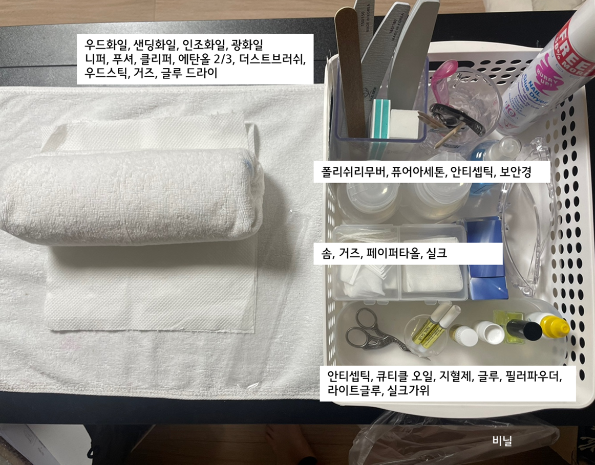 - 폴리쉬리무버는 1 과제 결과물인 매니큐어를 지우는 작업이 필요하기 때문이고 사전작업(우드파일 라운드 쉐입 잡아주기, 표면정리 및 애칭작업, 거스러미 제거)을 진행하므로 작업에 필요한 재료는 그래로 세팅이 되어 있어야 해요!