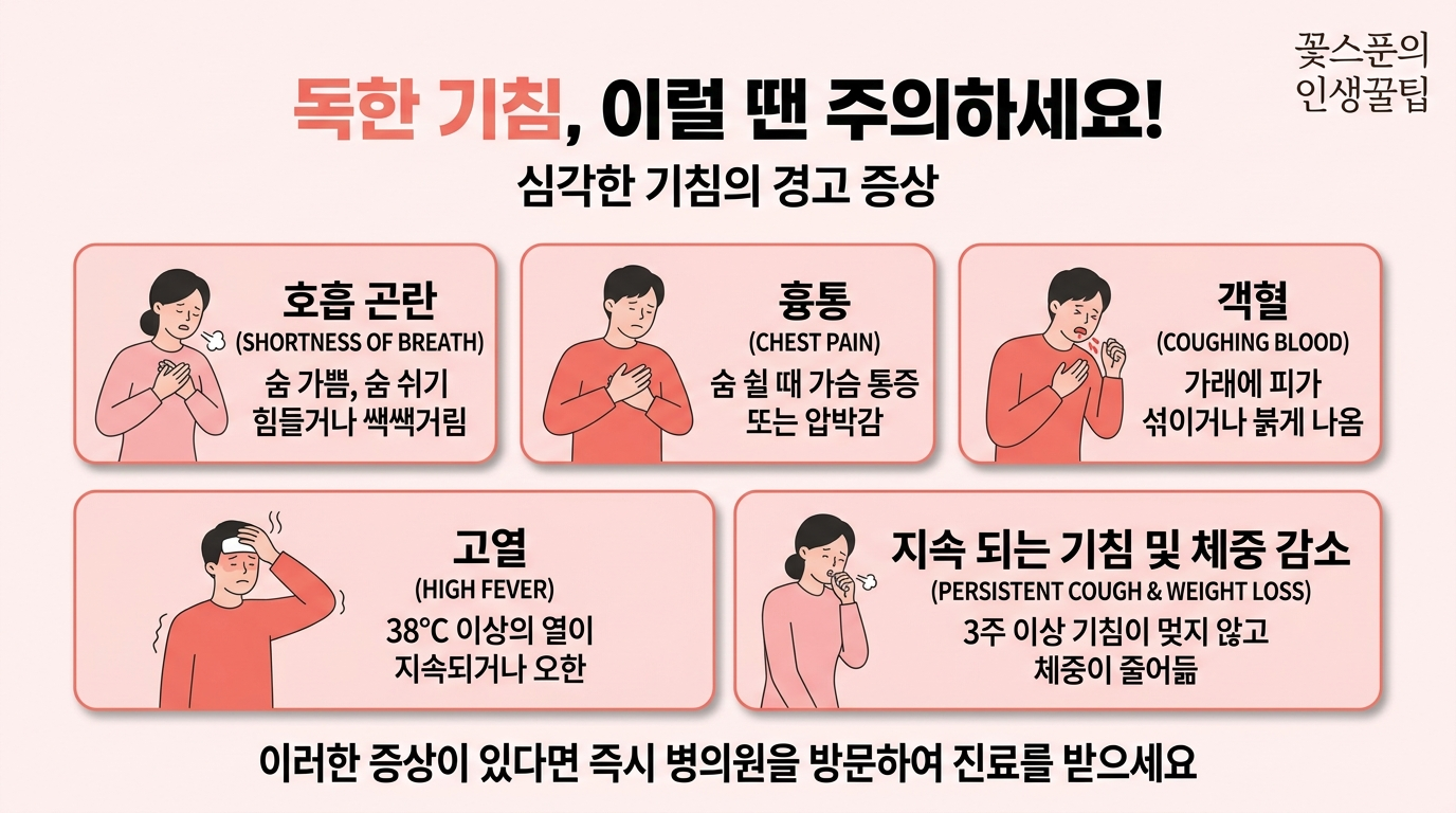 숨참, 피 섞인 가래, 고열, 흉통은 진료를 미루지 않는 편이 안전합니다.