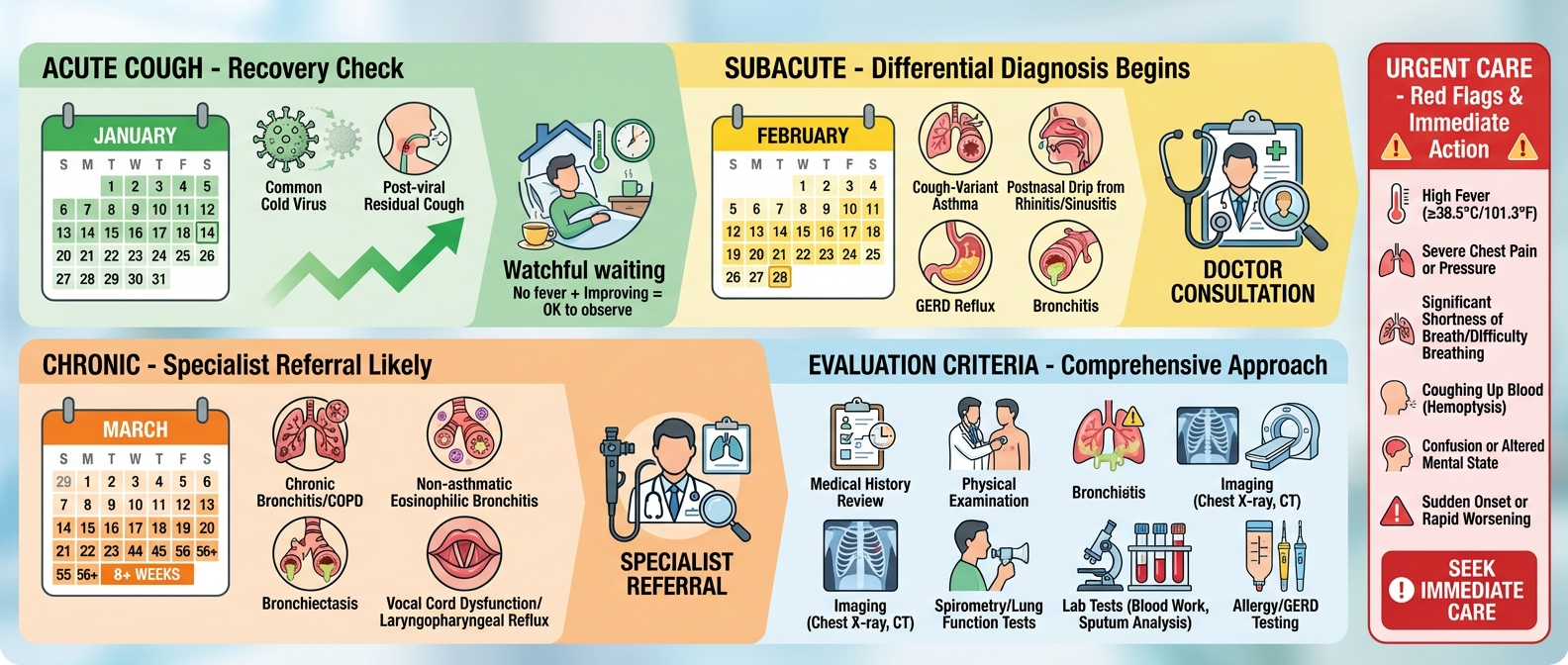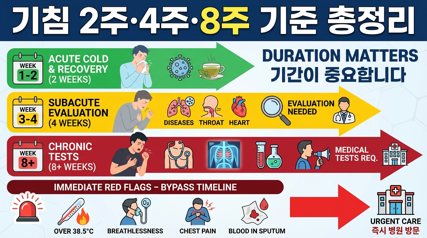 8주 이상 지속되면 만성 기침으로 분류하며, 흉부 X-ray 및 폐 기능 검사가 고려됩니다.