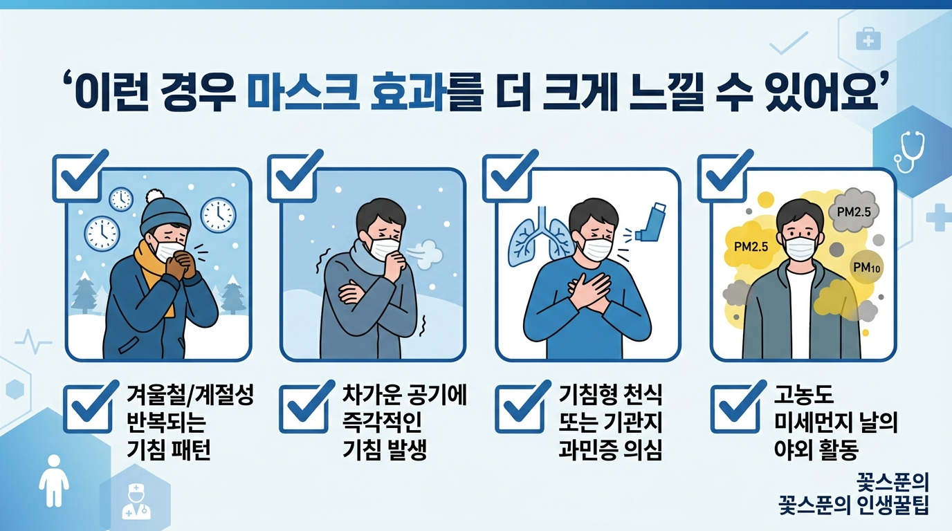 겨울 기침이 반복된다면 “감기 탓”으로만 넘기지 말고, 마스크를 기관지 보호 도구로 활용해보세요.
