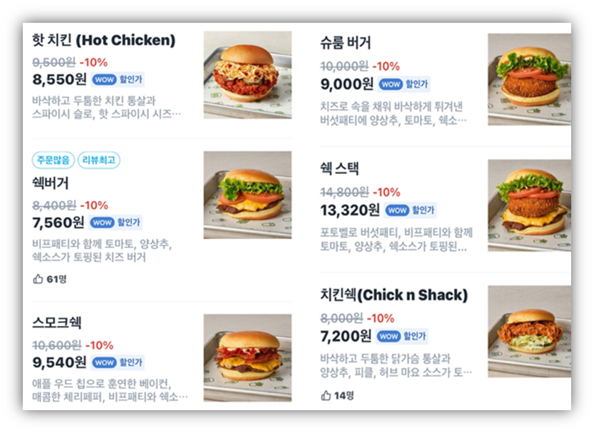 - 메뉴를 보면 알 수 있듯이 이름처럼 셰이크 종류가 많아요! 가격은 햄버거랑 같이 먹기에는 높은 편이라고 생각해요. 바니날 셰이크 기준으로 6,600원이니까요. 쿠팡잇츠에서 10% 할인받으면 5,850원! 그래도 콜라보다는 가격이 비싸죠! ^^ 좀 더 저렴하면 좋을 것 같네요!! 그만큼 quality가 다른지는 맛을 볼게요!