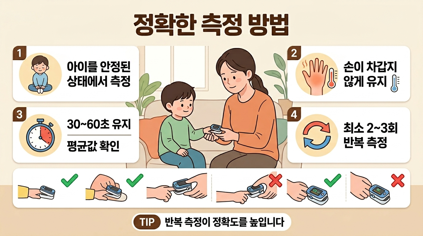 다만 움직임, 울음, 손이 차가운 상태 등에서는 2~4% 정도 흔들릴 수 있습니다. 그래서 반복 측정이 중요합니다.