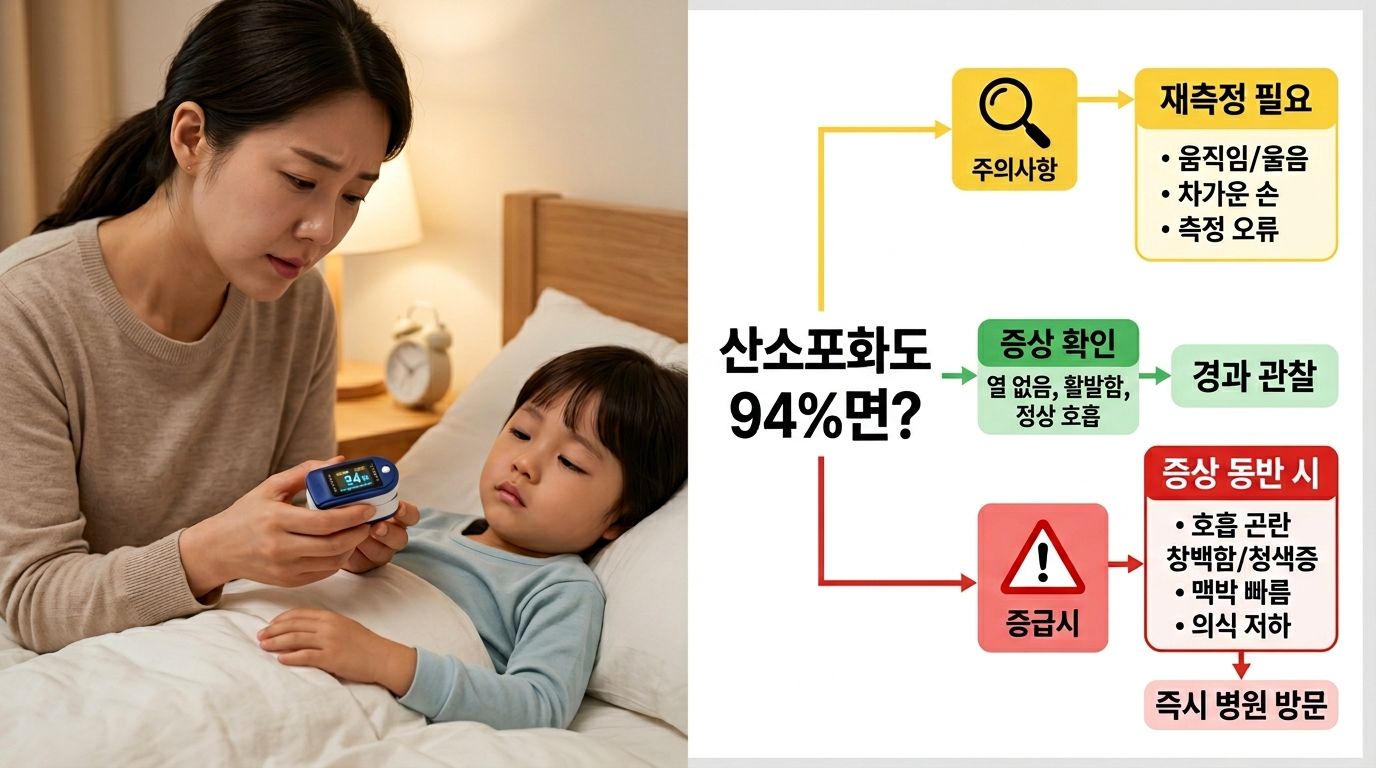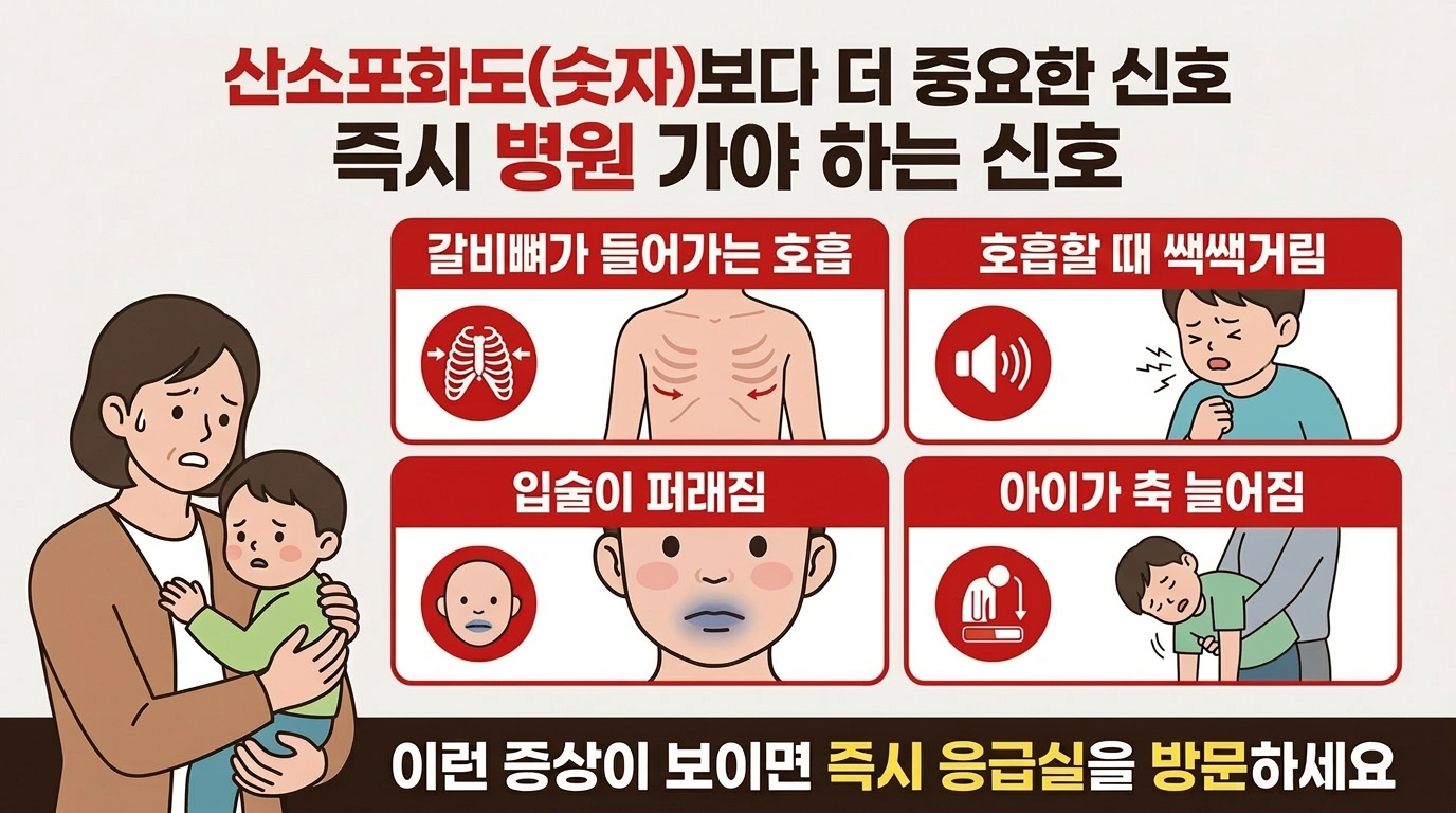 산소포화도는 경고등입니다. 숫자 하나보다 아이의 호흡 상태와 전신 증상을 함께 보세요.
