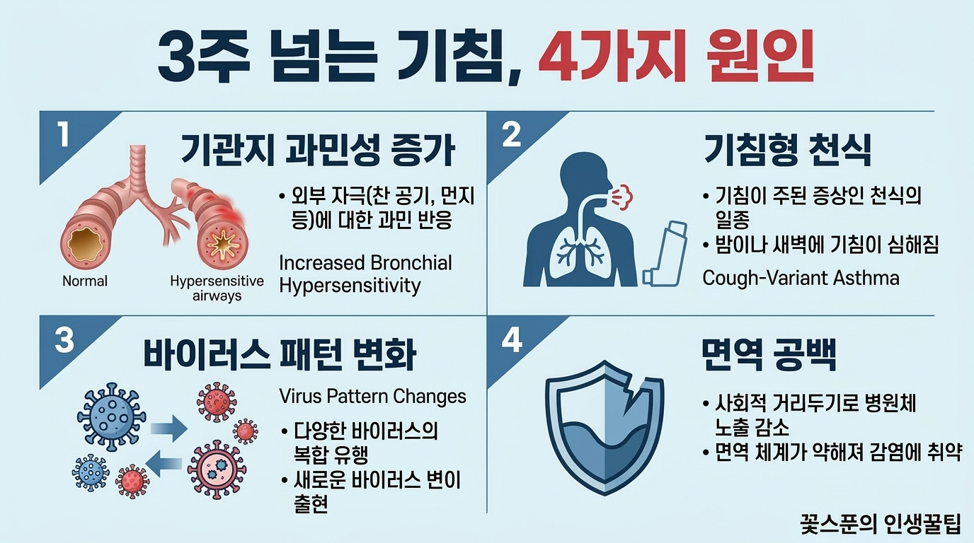 코로나 이후 감기 증상 변화가 있다고 느끼는 분들이 많습니다. 특히 요즘 감기 기침이 오래간다는 체감이 대표적입니다. 다만 “감기 바이러스가 전부 바뀌었다”기보다는, 감염 후 기도 반응성 변화 + 유행 패턴 변화가 겹친 결과로 설명하는 게 가장 안전합니다.