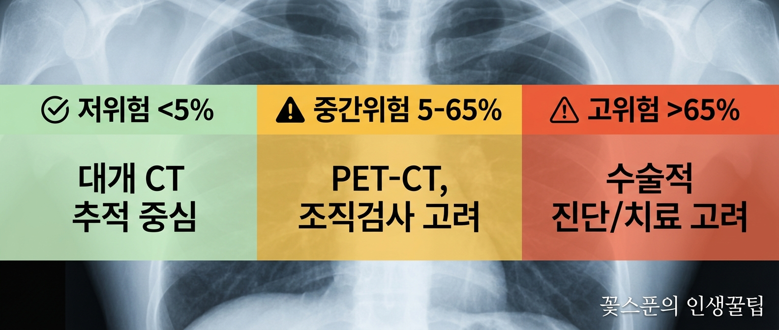✔ 실제 진료에서는 보통 저위험(<5%) / 중간위험(5–65%) / 고위험(>65%)으로 나누어 CT 추적, PET-CT, 조직검사, 수술 여부를 결정합니다