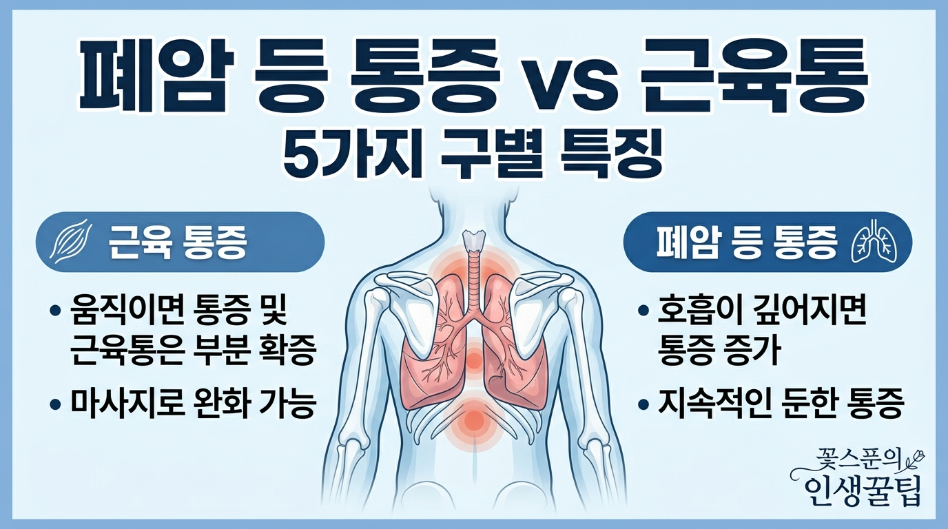 등이 아프면 대부분은 근육통이나 척추 문제를 먼저 생각합니다. 하지만 일부 폐 질환에서도 등 통증이 나타날 수 있습니다. 특히 폐 뒤쪽에 위치한 병변은 등이나 어깨 사이 통증으로 느껴질 수 있습니다. 다만 중요한 점은 대부분의 등 통증은 폐암이 아니라 근육통이라는 것입니다. 그래도 다음과 같은 특징이 있다면 폐 질환 가능성을 확인해 볼 필요가 있습니다.