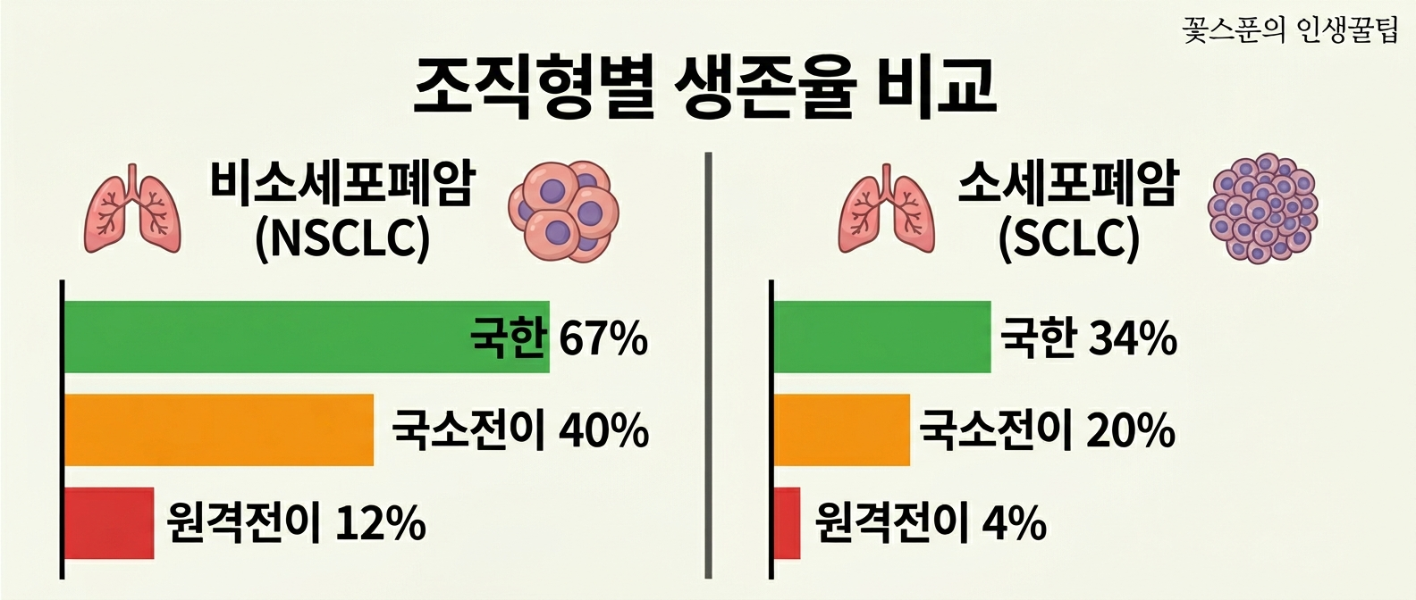 - 같은 병기라도 조직형(*NSCLC/SCLC), 유전자 변이, 치료 반응에 따라 달라집니다.