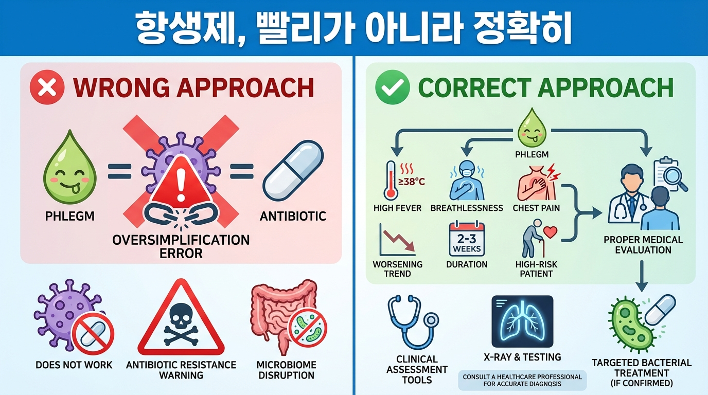 “초록 가래 = 세균 = 항생제”처럼 단순 공식으로 판단하면, 필요 없는 항생제를 먹고 손해를 볼 수 있어요. 항생제는 ‘빨리’가 아니라 ‘정확히’가 핵심입니다.