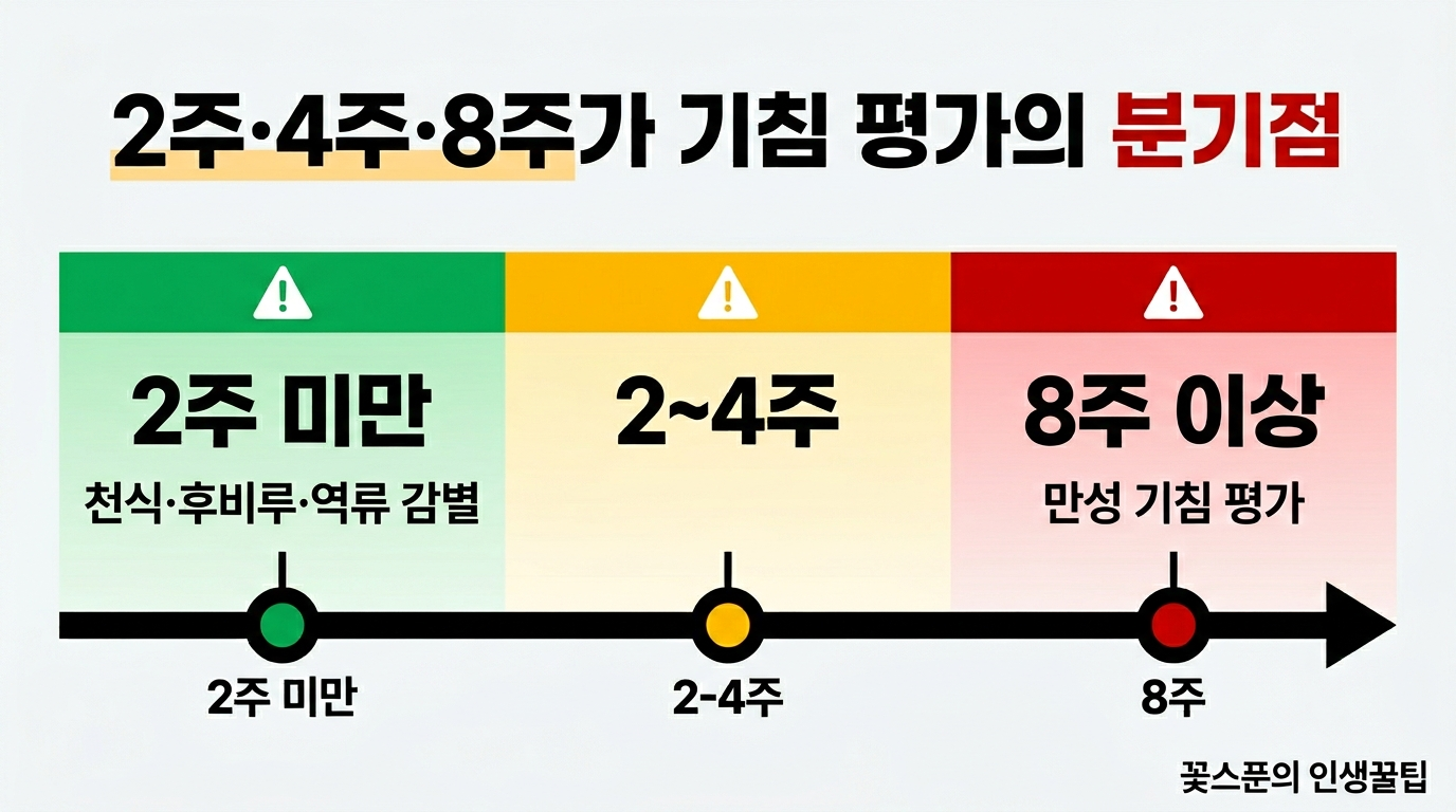 - 2주·4주·8주가 기침 평가의 분기점입니다.