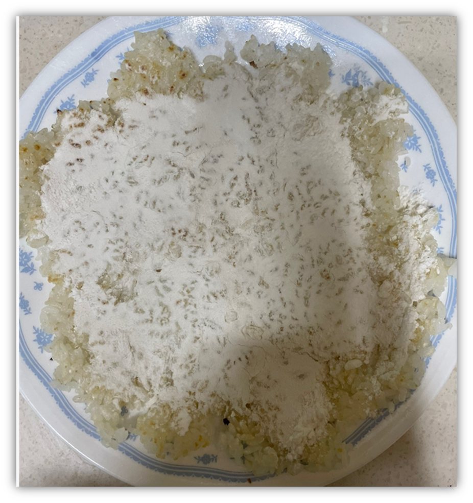 - 찹쌀가루를 누룽지 앞뒤로 골고루 무쳐 줍니다.(1분)