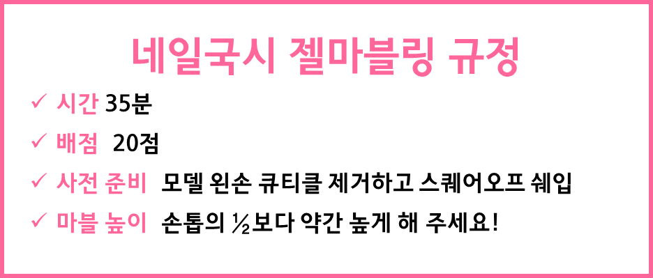 안녕하세요! 여러분, 오늘은 미용사(네일) 국가자격증 2 과제 젤 매니큐어 재료 준비와 과정에 대해 함께 정리해 봐요!! 2 과제 시간은 제가 시험 볼 때 가장 떨렸던 시간이었어요. 젤로 선을 긋는 동작 자체가 집중력을 높여서 해야 하는 작업이기 때문에 동작이 크지 않고 몰입도가 매우 높은 과제라고 할 수 있어요. 감독관님께서 자세히 지켜보는 순간 그 떨림은 뭐라 표현할 수가 없어요. 하지만 평소에 연습한 대로 차분히 당당한 마음으로 하는 것만이 2 과제의 높은 산을 넘을 수 있답니다!!! 그래서 평소에 습관적으로 선마블링과, 부채꼴마블링은 마네킹 손에라도 연습을 하고 정해진 35분 안에 슥슥 그을 수 있는 연습을 해야 해요~
