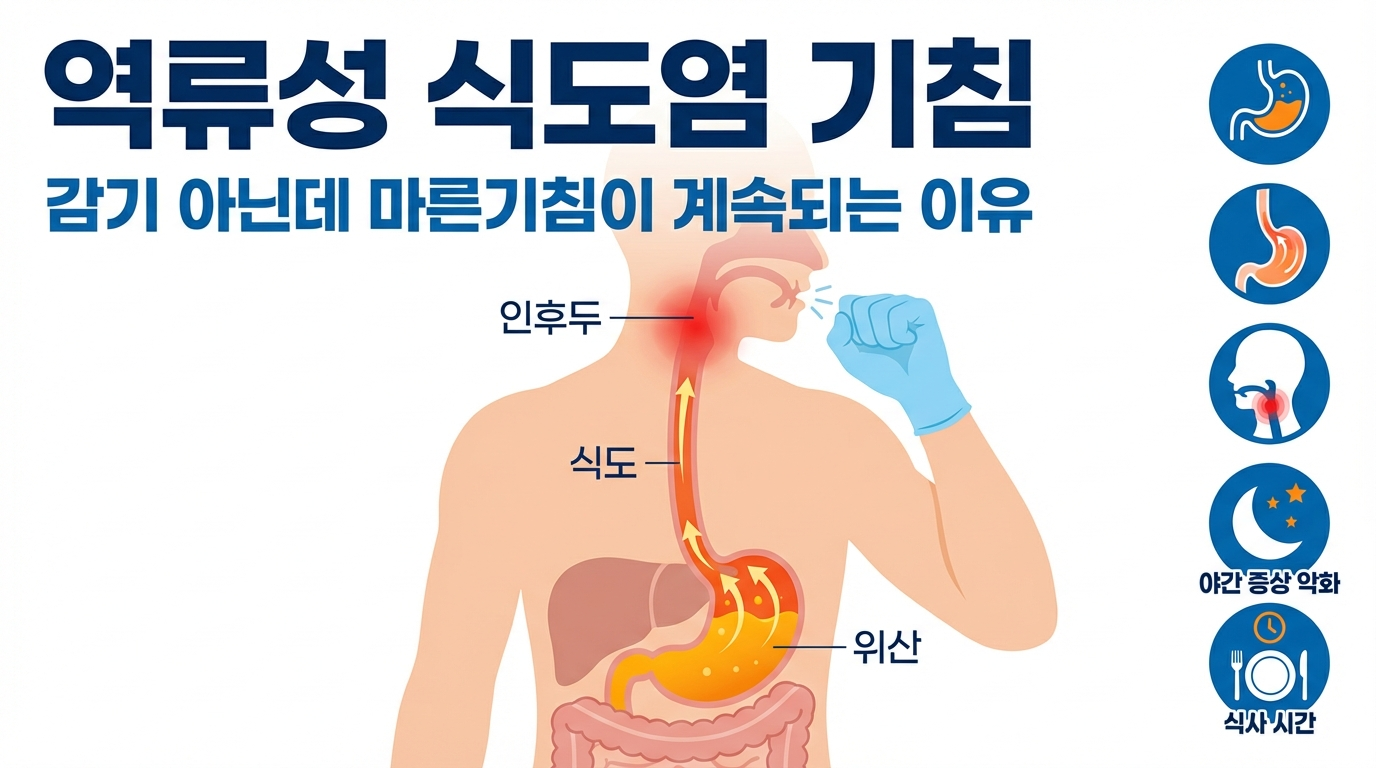 열은 없는데 마른기침이 몇 주째 지속된다면, 단순 감기보다 역류성 식도염 기침(GERD cough) 가능성을 먼저 확인해볼 수 있습니다. 특히 식후 또는 누우면 기침이 심해지는 패턴이 반복된다면 더 의심해볼 만합니다.