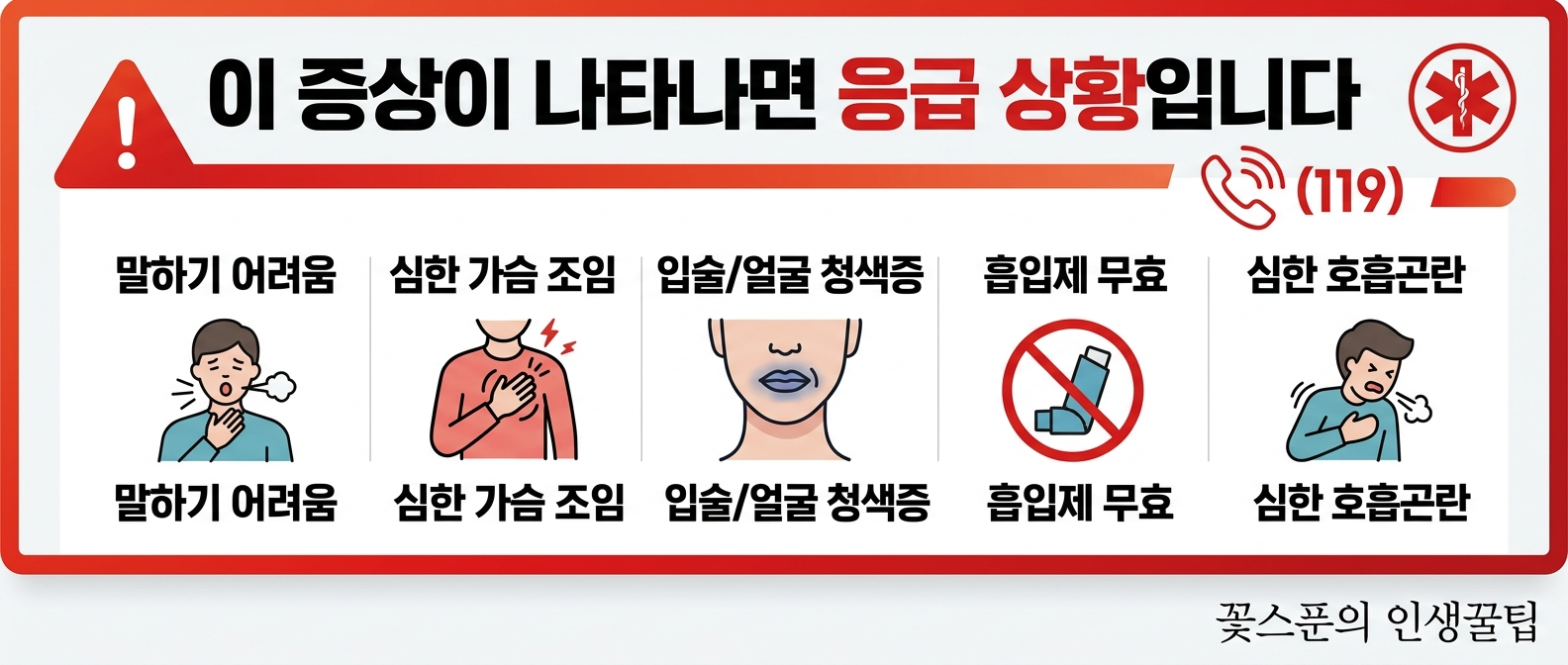 - 말하기 어려울 정도의 호흡곤란, 입술 청색증, 흡입제로도 호전 없음은 응급 신호일 수 있습니다.